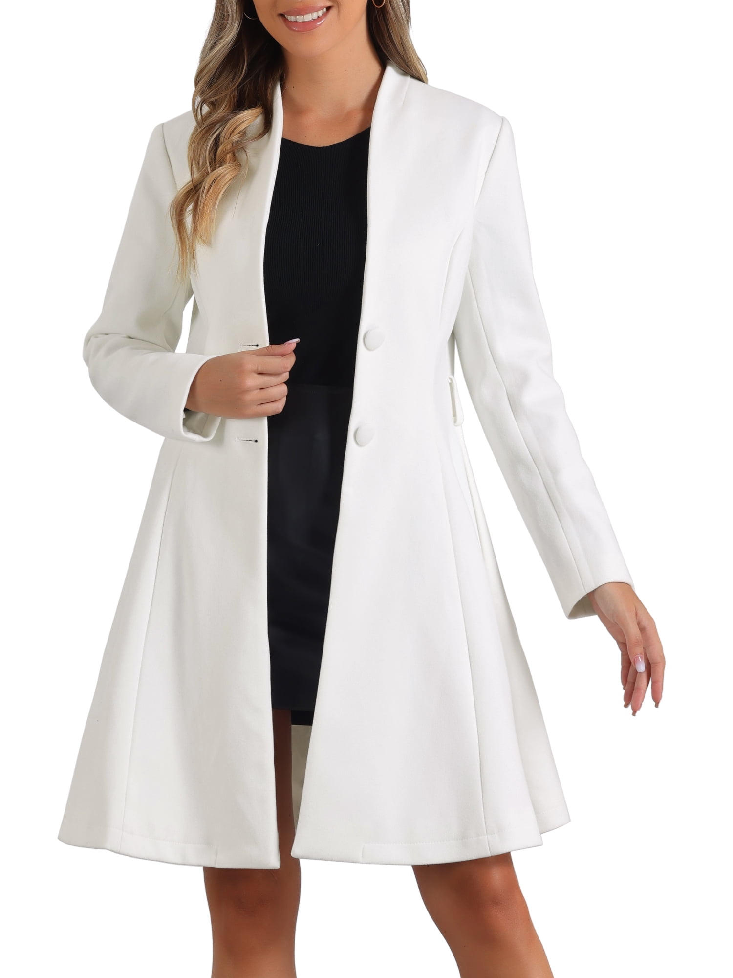 Perfect for fall or winter, this versatile coat features a collarless look, A-line cut, single-breasted, long sleeves and slanted pockets, and is fully lined for comfort.